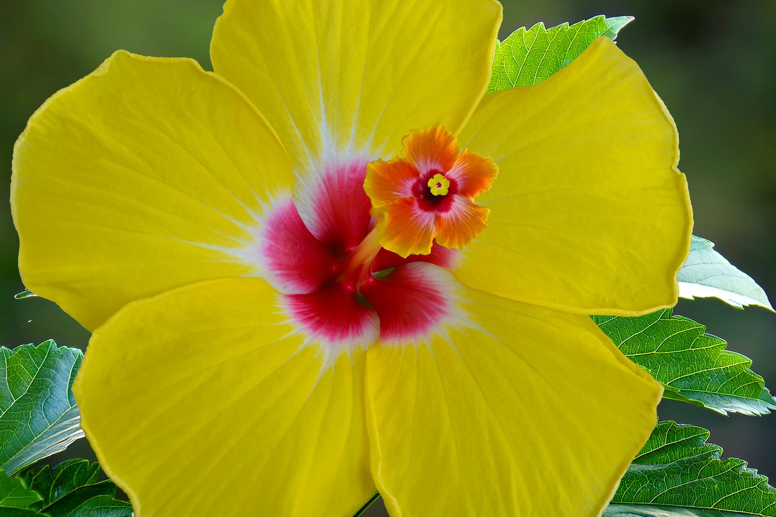 This captivating photo-art unveils a “rare botanical marvel”, where nature and artistry intertwine seamlessly. An elegant yellow hibiscus serves as the foundation, its petals cradling an unexpected centerpiece —a second bloom (in place of the stamen) ablaze with fiery hues of orange and red. The delicate fringed edges create a mesmerizing gradient, blending effortlessly into the golden embrace of the larger flower. At its core, a third hibiscus stands in place of the stamen, completing this intricate floral fusion. Lush green foliage surrounds the composition, deepening the vibrancy and contrast of each bloom. A celebration of layered beauty, this image transforms botanical elements into a striking, sculptural masterpiece.